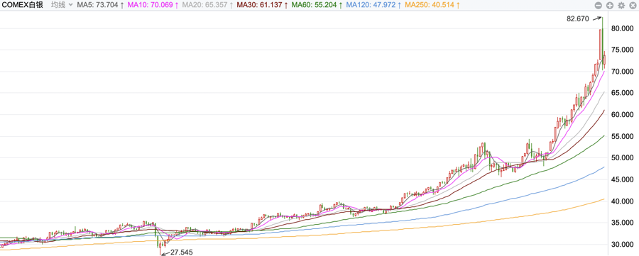 北京时间12月29日上午,COMEX白银期货价格一度冲高至每盎司82.67美元,创下历史新高。然而市场还未来得及欣喜,白银价格随后急转直下,收盘时价格落于每盎司71.64美元。